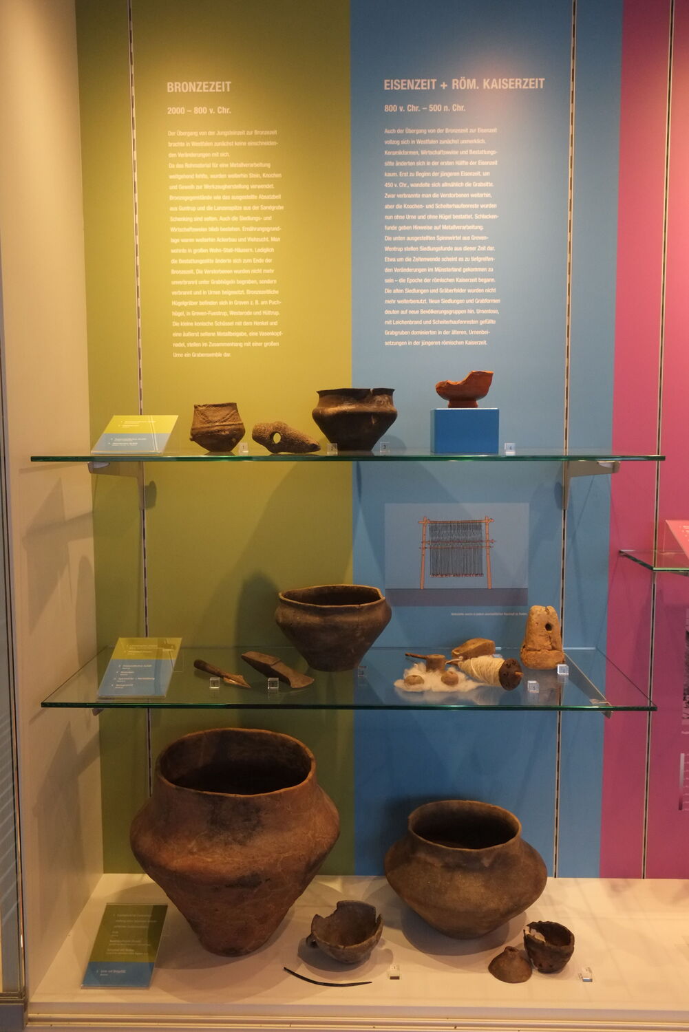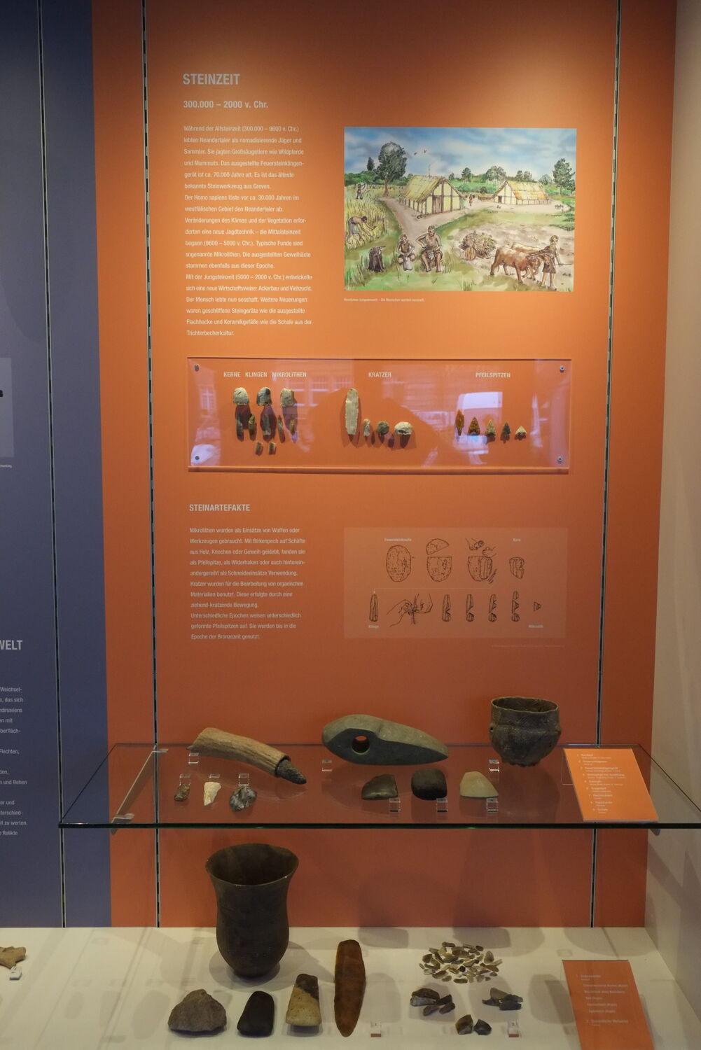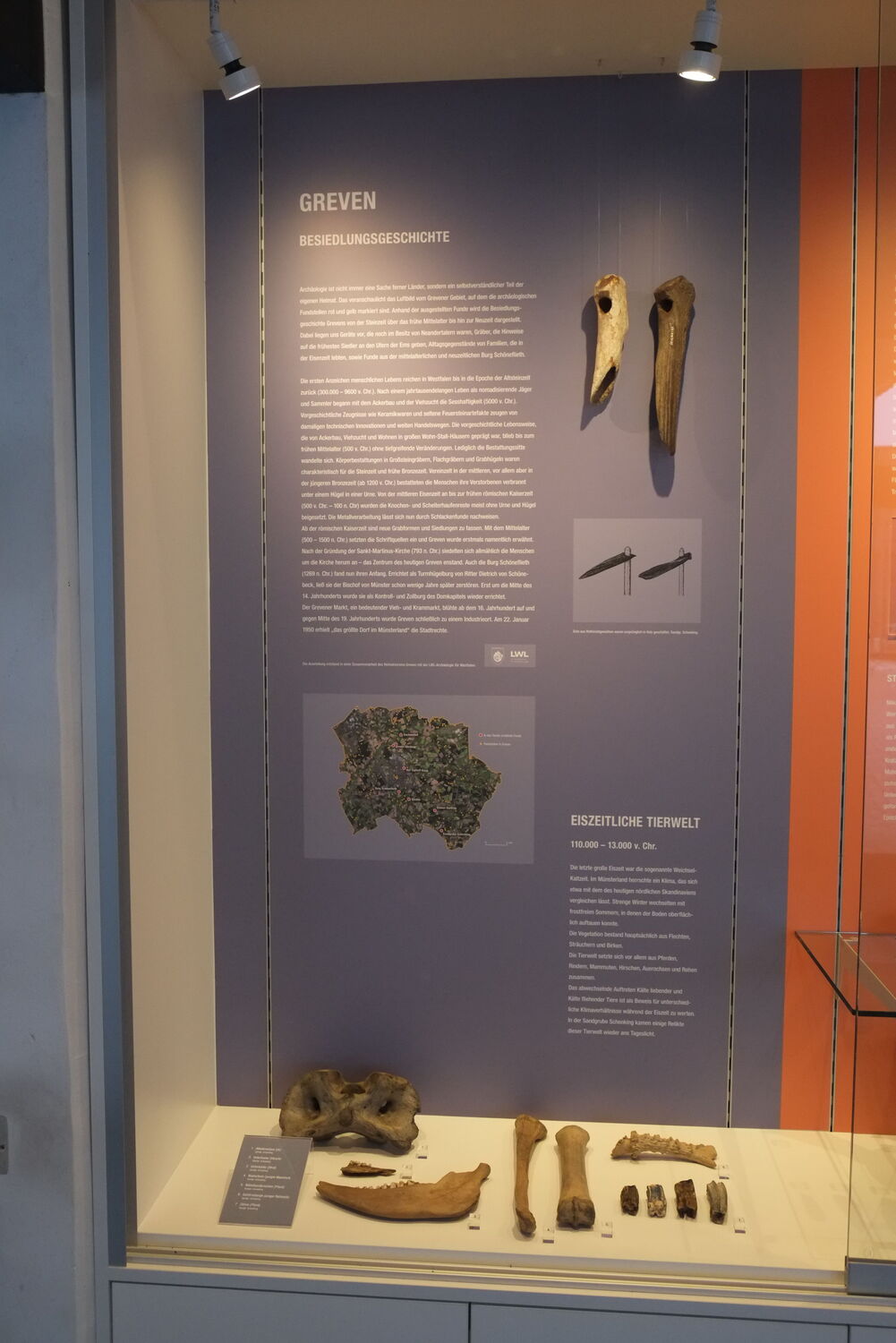 Ausschließlich Fundstücke aus Greven, von der eiszeitlichen Tierwelt über Orakelsteinchen aus dem frühen Mittelalter bis hin zur Zeit der Burg Schöneflieth werden gezeigt und so ein anschaulicher Überblick über mehr als 100.000 Jahre Geschichte unserer Heimat geboten. Das alles vor einer die Zeitabschnitte farbig verdeutlichenden Rückwand mit Bildern und Erklärungen.