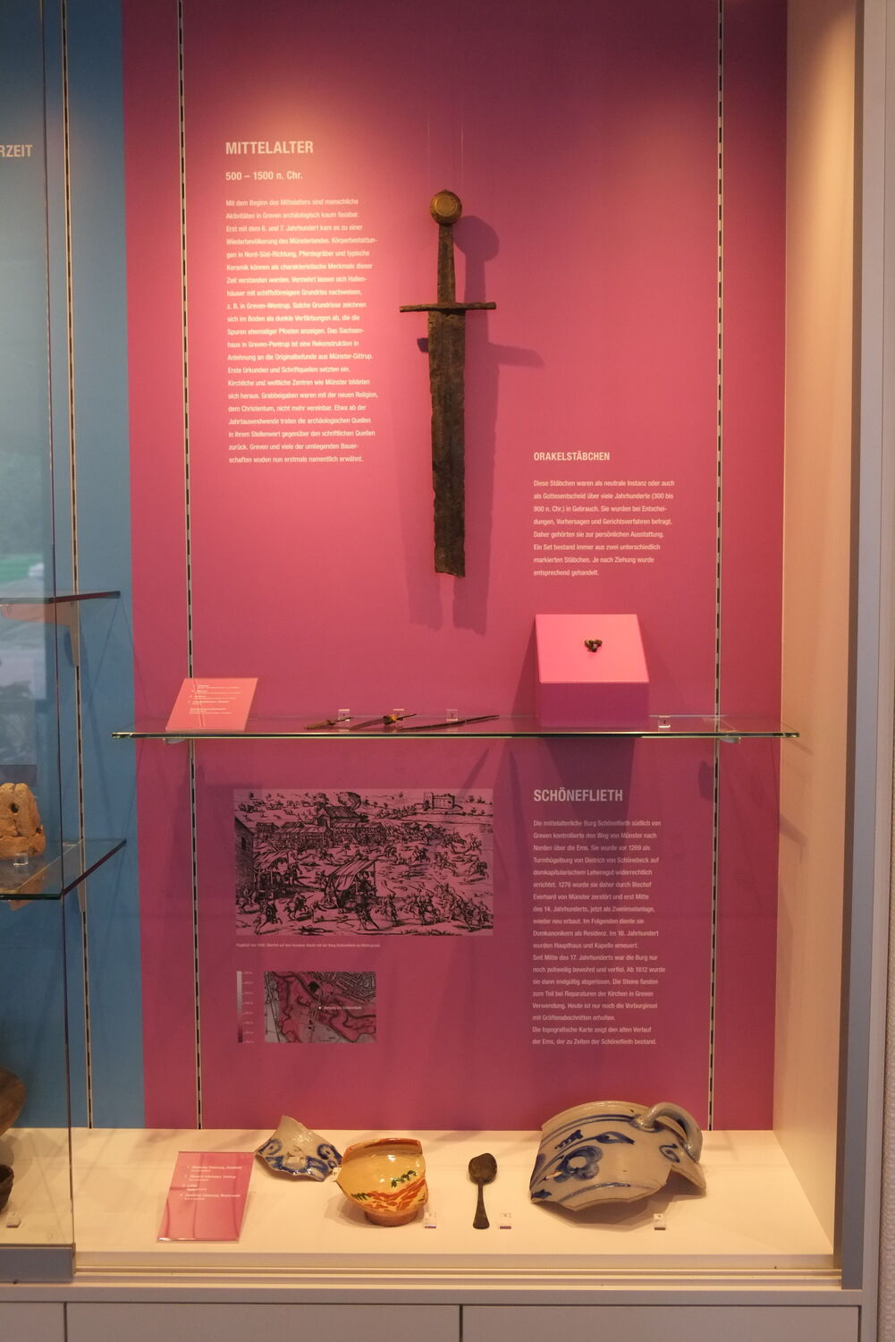Diese Ausstellung hatte das Archäologische Fachgebiet des Heimatvereins zusammen mit dem LWL 1988 eingerichtet. Vielen Bürgern, Schulklasssen und Stadtführungen diente sie zur Anschauung von der ältesten Geschichte Grevens bis hin zur Burg Schöneflieth. Auch vertrieb sie manchem vorm Bürgerbüro Wartenden die Zeit.