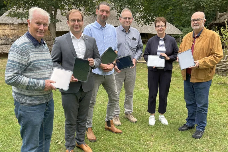 Seit 2024 ist der Status des Museums als „außerschulischer Lernort“ offiziell durch die Bezirksregierung Münster anerkannt. Die Stadt Greven unterstützt diesen Weg und stellt dem Heimatverein 15 robuste Lehr- und Lern-Tablets zur Verfügung, die Bürgermeister Dietrich Aden und Fachbereichsleiterin Beate Tenhaken jetzt am Sachsenhof an Werner Peters und Rainer Koch vom Heimatverein übergeben haben. Mit dabei auch Lehrer Martin Steinbrink, der im vergangenem Sommer durch die Bezirksregierung mit einigen Stunden an das Museum abgeordnet worden ist. Steinbrink und ein zweiter abgeordneter Kollege betreuen für jeweils vier Stunden in der Woche die Schulprogramme am Sachsenhof pädagogisch. Beide Lehrer können den Klassensatz Tablets auf vielerlei Arten für den praktischen Unterricht vor Ort einsetzen: zum Beispiel, um altersgerecht Informationen über den Sachsenhof und seine Zeit zu vermitteln, als App-gestützes Medium, um Pflanzen auf dem Museumsgelände zu bestimmen oder auch als Mittel, um gemeinsam erarbeitete Gruppenergebnisse aufzubereiten und über den museumseigenen Beamer zu präsentieren. Bürgermeister Dietrich Aden ist überzeugt, dass die von der Stadt angeschafften Tablets dem Lernen auf dem Sachsenhof noch mal einen Schub geben können: „Wir mussten da gar nicht lange nachdenken und freuen uns, dass wir mit den Geräten helfen können, diesen besonderen Lernort zu stärken“, so Aden. „Das ging alles total unkompliziert und schnell“, lobt auch Werner Peters vom Heimatverein das Zusammenspiel mit der Stadt. Bis zu 1000 Schülerinnen und Schüler kommen pro Jahr zum Museum Sachsenhof, um die immer wieder aktualisierten Angebote des Lernorts zu nutzen.