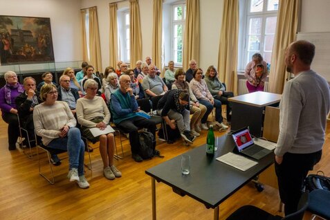 Am Mittwoch, den 16.04.25, waren 30 Teilnehmer der Fachgruppe Familienforschung zu Gast im Bistumsarchiv in Münster. Im großen Saal des historischen Gebäudes erläuterte der Archivar Lennart Metken Besonderheiten der Kirchenbücher, die ja auch online verfügbar sind.