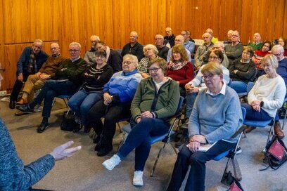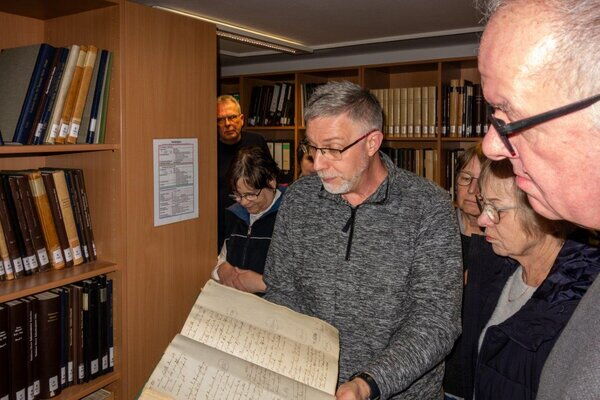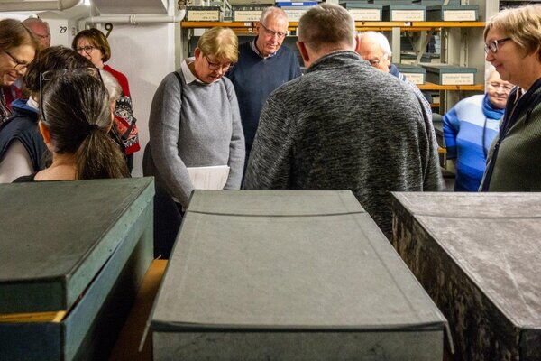 Nach dem Vortrag und einer kurzen Kaffee- und Kuchenpause, in der angeregt diskutiert wurde, ging es in die Tiefen des Archivs. Dort besichtigten die Teilnehmer historische Dokumente und Aufschwörungstafeln. Am Ende waren sich alle einig: Wir kommen wieder.