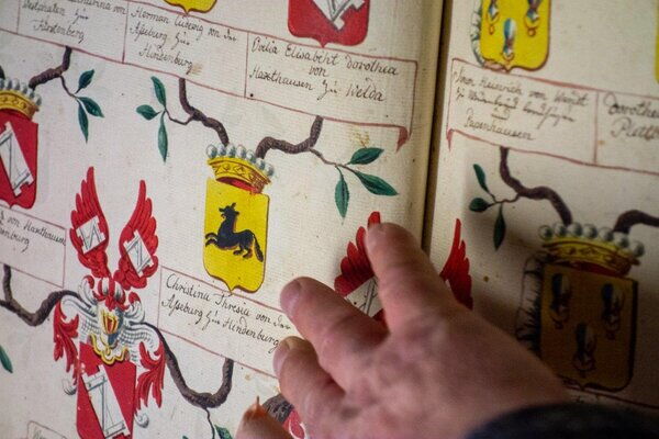 Am Bohlweg begrüßte Dr. Jens Heckl die Gruppe und hielt einen kurzweiligen Vortrag über die Geschichte des Archivs und der Archivalien, die im Landesarchiv eingelagert sind. Besonders im Fokus standen Akten und Unterlagen, die für die familiengeschichtliche Forschung von Bedeutung sind. So hatte Dr. Heckl eine Personenschatzung des Kirchspiels Greven von 1672, oder ein Dokument mit 25 kolorierten Zeichnungen über die Ländereien des Hofes Albachten bereitgelegt.