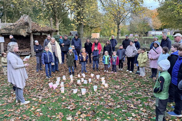 In Sachsenhofzentrum konnten die Kinder dann selbst Lichter basteln, die später mit den Namen von Vorfahren beschriftet wurden und in einer Lichterspirale aufgestellt wurden. Basteln stand am Nachmittag weiter hoch im Kurs, als die Kleinen unter Anleitung von Ulrike Krau Kräutersäckchen herstellten und dabei manches über die Bedeutung der Kräuter bereits zur Sachsenzeit erfuhren. Auch für das leibliche Wohl der Besucher war gesorgt. Während die Eltern und Großeltern bei einer Tasse Kaffee und Kuchen die Kinder bei Basten beobachten konnten, gab es für diese auch kindgerechten Kuchen, Plätzchen sowie diverse Kaltgetränke. Nach einen Lichterumzug mit einem alten traditionellen Lied wurde in einer großen Feuerschale vor dem Haus nach Kartoffeln gegart, die mit einem leckeren Kräuterdip großen Anklang fanden. Aufgrund der außerordentlich positiven Resonanz wird der Heimatverein künftig solche speziell für Eltern und Großeltern mit Kindern gedachten Veranstaltungen wiederholen. Interessenten können sich dazu auch mit Wünschen und Ideen jederzeit beim Heimatverein melden.