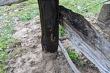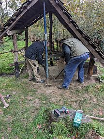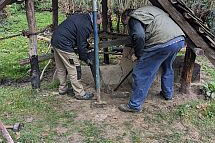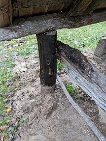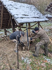 Die tragenden Pfosten mussten dringend ausgetauscht werden. Für die schweißtreibende Arbeit ist die ruhige Winterzeit bestens geeignet. Die alten Pfosten werden in der Konstruktion gelöst und dann ausgegraben. Es zeigte sich, dass an einigen Pfosten, unterhalb der Erdoberfläche, kein Holz mehr vorhanden war.