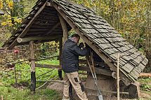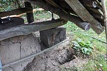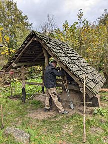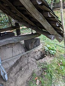 Bei frühmittelalterlichen Gebäuden sind die tragenden Pfosten im Erdboden eingegraben. Durch die Erdfeuchtigkeit verrotten sie mit der Zeit. Die Haltbarkeit ist maximal 25 Jahre, meist kürzer. Dieser Zustand war nun auch beim Schutzbau unseres Töpferofens erreicht.