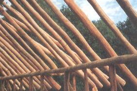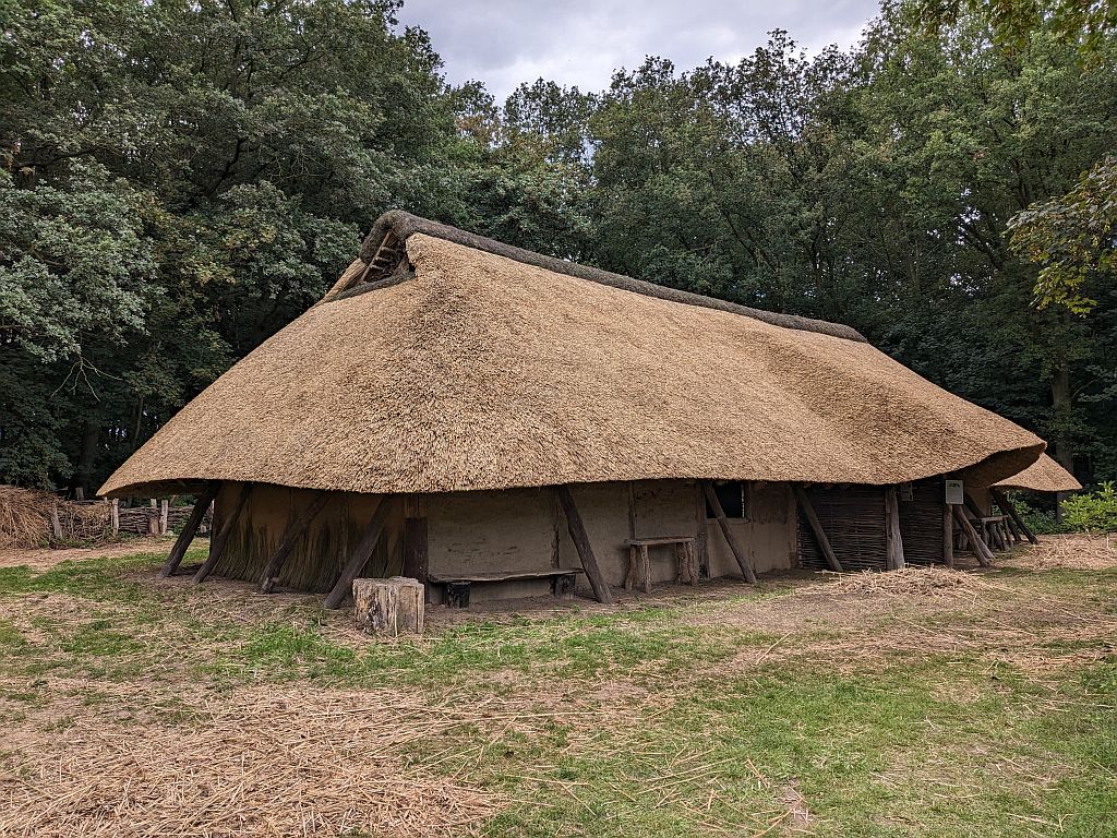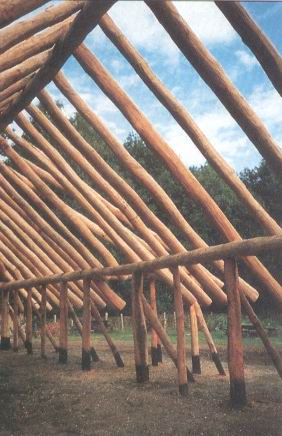 Auf den Wandpfosten liegt eine umlaufende Reihe von Hölzern, das Rähm, auf. Auf dem Rähm ruhen die Dachsparren, an deren oberem Ende die Firstpfette befestigt ist. Zwischen den Sparren waagerecht angebrachte dünnere Hölzer halten das als Dachbedeckung verwendete Reet.