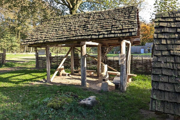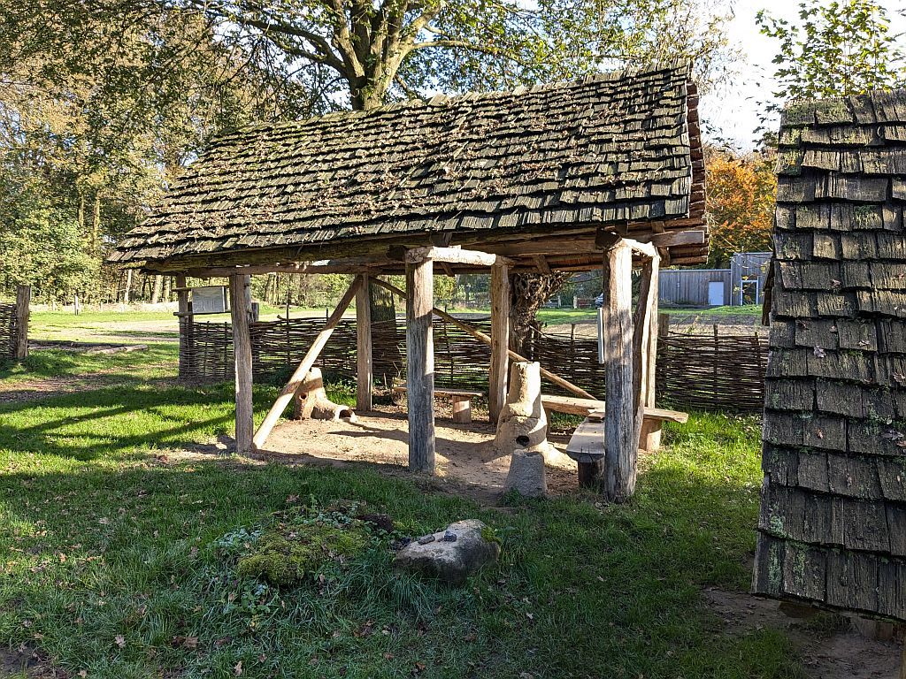 Unter diesem Schutzdach (rechts) in Pfostenbauweise mit schindelgedecktem Satteldach befinden sich verschiedene technische Öfen. Für dieses Gebäude gibt es keinen archäologischen Befund.