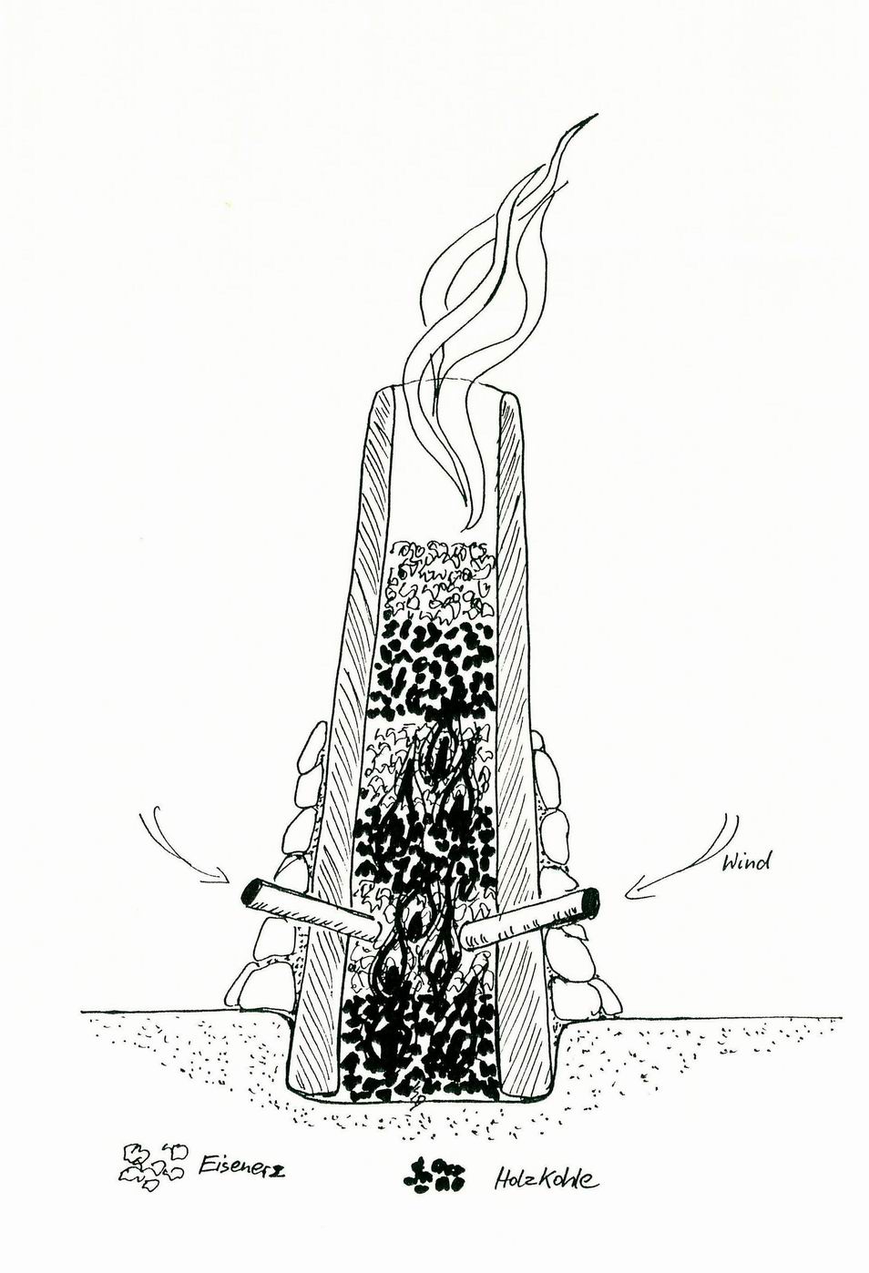Rekonstruiert ist beispielhaft ein Rennofen. Es ist ein aus Lehm gebauter Schachtofen von etwa 1,20 m Höhe, der mit einer Düse belüftet wird. Da sich überall in der näheren Umgebung Raseneisenerz findet, waren viele sächsische Höfe in der Lage ihr benötigtes Eisen, weitgehend selbständig herzustellen. Frühmittelalterliche Befunde dazu gibt es z. B. in der Nachbargemeinde Saerbeck.
